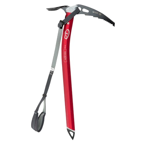 The Italian-made Climbing Technology Alpin Ice Axe is a robust general walking axe essential for snowy mountaineering trips. Favoured within the alpine community for offering versatility while remaining affordable. Designed with a hardened steel pick and adze the axe delivers the perfect bite for alpine use. A heavier head delivers efficient usage. The axe is T rated and so it is suitable for classic mountaineering routes, especially as it has a well-curved pick, a wide adze for step-cutting, and a curved shaft. There’s no rubberised grip on the lower shaft but there is a padded wrist support on the adjustable leash. You can get the biggest mitt into the wrist loop too. The Alpin Tour has a hexagonal shaft that is slightly easier to grip with cold and wet hands or gloves than an oval one.