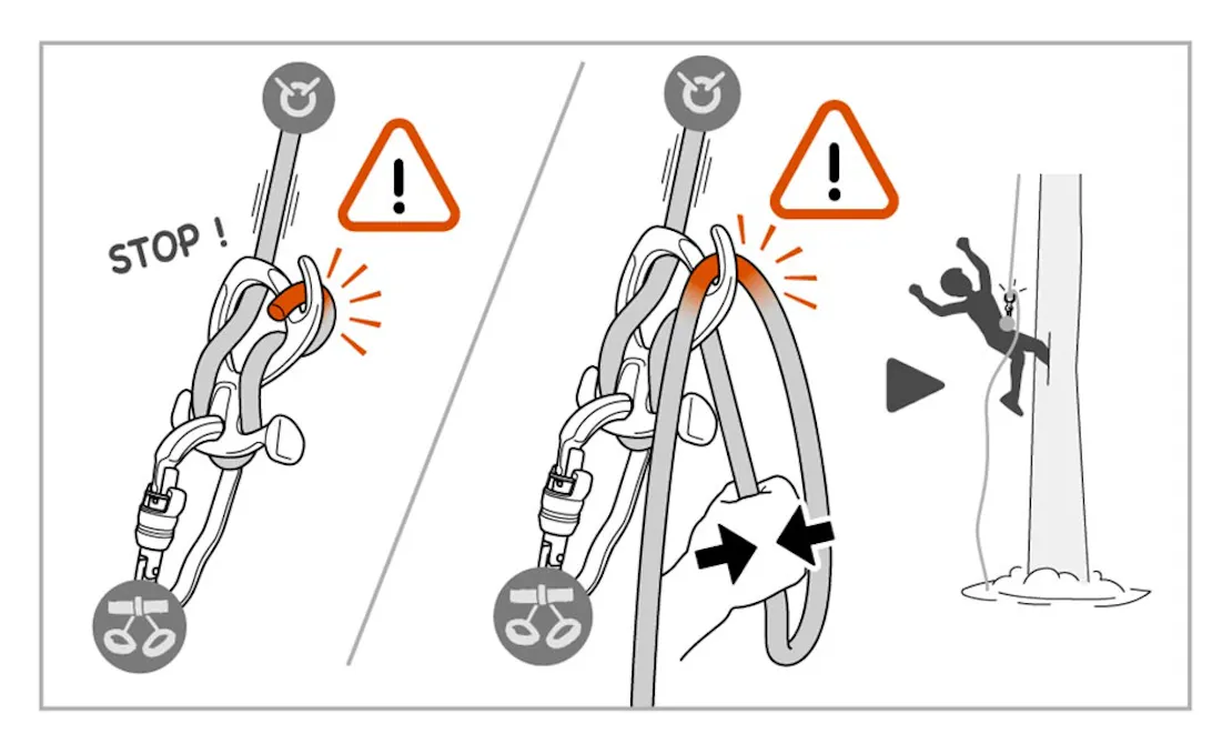 In certain situations, where the user lets the rope slide freely through the PIRANA to intentionally drop into the water, the rope runs quickly through the descender and can accidentally get blocked in the PIRANA's blocking slot. The user is then stuck, and may not be able to remove the rope from this position. This situation can be dangerous, with a drowning risk, especially if the user is stuck under a waterfall or in a pool of water.